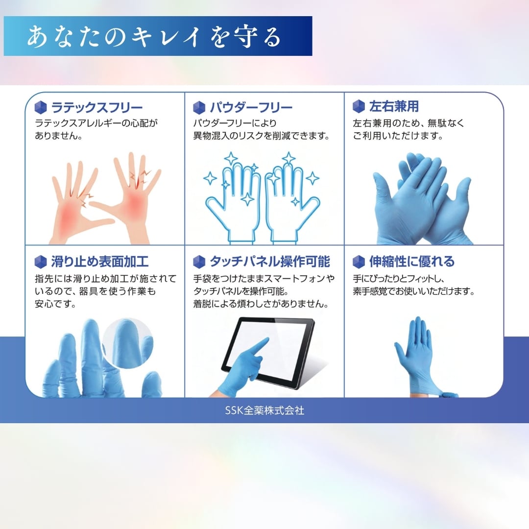 SSKニトリルグローブIB パウダーフリーは、快適さと安心を両立したグローブです。独自のニトリル素材で作られており、柔らかさと耐久性を兼ね備えています。さらに、パウダーフリーなので、アレルギーの心配もありません。医療現場はもちろん、食品業界や美容業界など、さまざまな職種で活躍しています。